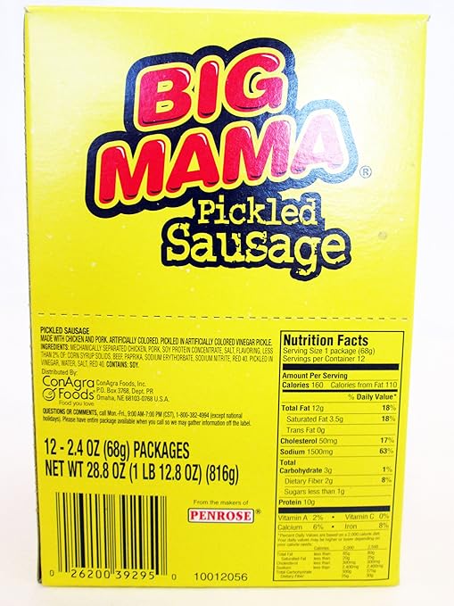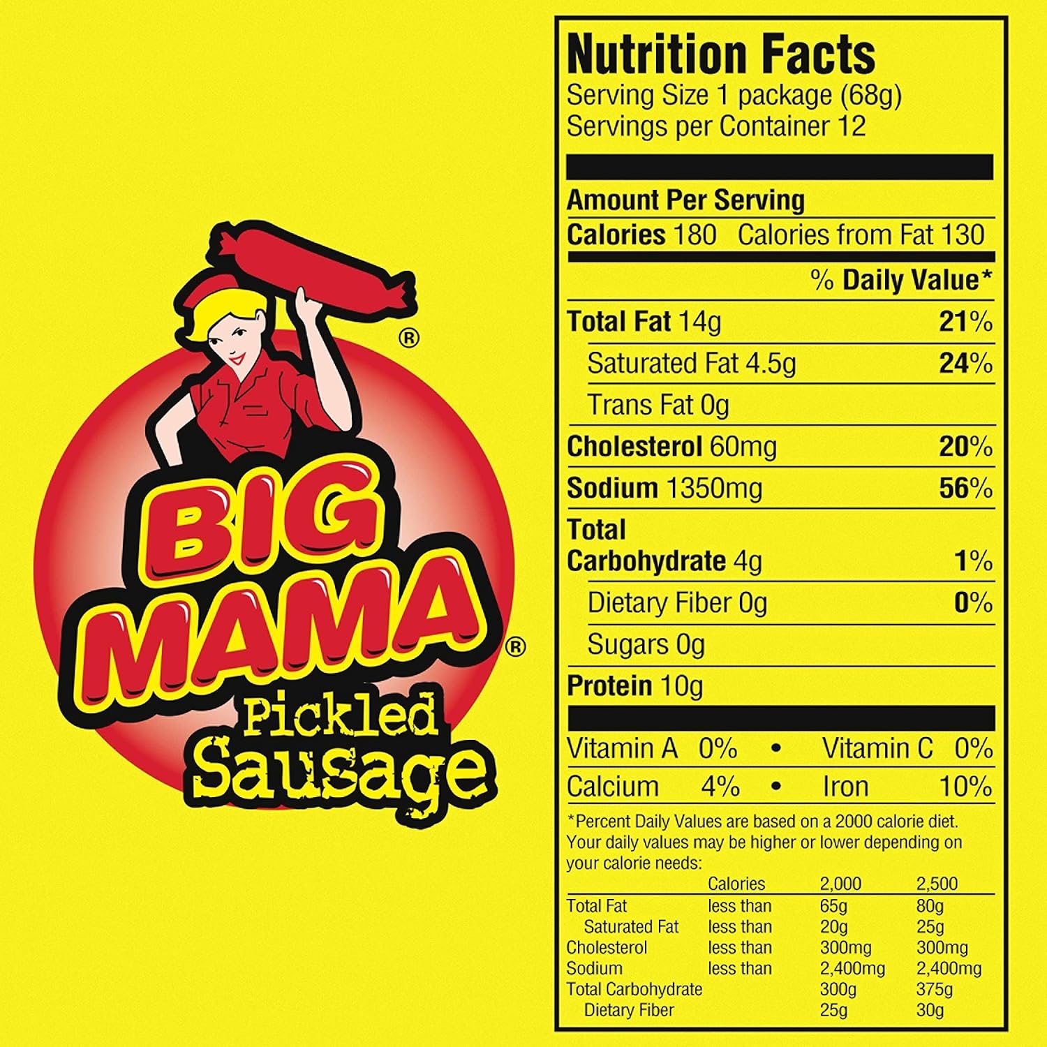 Big Mama Pickled Sausage 12ct individually wrapped. Description Personalized health review for Tijuana Mama Sausage Pickled. They have zero grams per serving of trans fat.